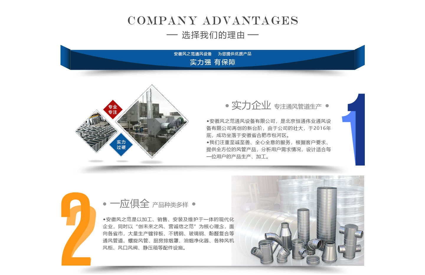 安徽風(fēng)之范通風(fēng)設(shè)備有限公司,是北京恒通偉業(yè)通風(fēng)設(shè)備有限公司再創(chuàng)的新臺階,多年來,公司員工憑著“誠信敬業(yè)、團(tuán)結(jié)拼搏、勇于開拓、務(wù)實(shí)進(jìn)取”的企業(yè)精神,先后承接了多項(xiàng)重點(diǎn)工程項(xiàng)目,使公司健康穩(wěn)步發(fā)展。現(xiàn)由于公司的壯大,業(yè)務(wù)的拓展,又于2016年底,成功坐落于安徽省合肥市包河區(qū)。本公司生產(chǎn)設(shè)備精良,技術(shù)力量雄厚,質(zhì)保體系完善!讓用戶體驗(yàn)到,貼心的服務(wù),無憂的售后!風(fēng)之范是以加工、銷售、安裝及維護(hù)于一體的現(xiàn)代化企業(yè),同時(shí)以“創(chuàng)未來之風(fēng)、營誠信之范”為核心理念,面向全國各省市,大量生產(chǎn)鍍鋅板、不銹鋼、玻璃鋼、酚醛復(fù)合等通風(fēng)管道、螺旋風(fēng)管、廚房排煙罩、油煙凈化器、各種風(fēng)機(jī)風(fēng)柜、風(fēng)口風(fēng)閥、靜壓箱等配件設(shè)施。廣泛承接商場、工廠、酒店、寫字樓、地下室等,消防排煙工程、除塵凈化工程、室內(nèi)通風(fēng)工程、暖通空調(diào)工程、廚房排煙凈化工程。我們力求上進(jìn),追求,歡迎各界人士技術(shù)指導(dǎo),經(jīng)濟(jì)合作,共創(chuàng)美好明天!